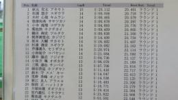 2WDクラス予選1ラウンド目は、KYOSHOの秋元選手がトップタイムをマーク。多少のミスはあったものの全体的なペースが速く、ただ一人15周に突入しました。2位・3位は14周5分0秒台をマークした杉浦選手・木村選手が続いています。