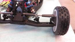 マシンのフロントアームはヨコモ製のガルアームを移植して特性を変えています。フロントの動きがマイルドになって運転しやすいとのことでした。