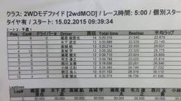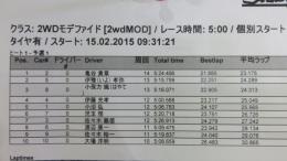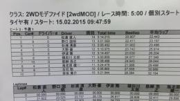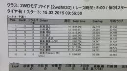2WDモディファイドクラスは、ヒートが進むごとにタイムが更新される激しい争い。トップは杉浦悠介選手で14周5分4秒をマーク。2位は松倉選手、3位は梶原選手と続いています。
